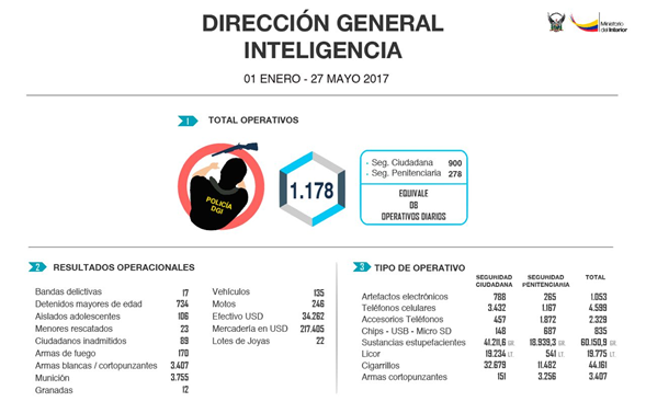 La DGI, en lo que va del año, ha desarrollado 1.178 operativos: 900 en seguridad ciudadana y 278 en seguridad penitenciaria, con la desarticulación de 17 bandas delictivas que operaban en el país. Durante estos operativos se detuvo a 734 mayores de edad, 106 adolescentes aislados, 23 menores rescatados y 89 ciudadanos inadmitidos. Asimismo se ha decomisado 170 armas de fuego, 3.407 armas cortopunzantes, 3.755 municiones, 12 granadas, 4.599 teléfonos celulares y 34 262 dólares.