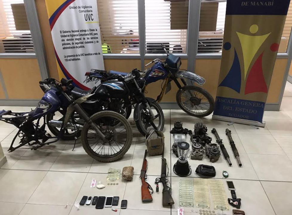 En el momento del operativo ejecutado en horas de la madrugada, por elementos de la Policía Judicial y la Fiscalía, encontraron 960 gramos de cocaína, dos armas de fuego calibre 16, tres motos de dudosa procedencia, 766 dólares, dos billetes falsos de 20 dólares, nueve terminales móviles, una munición, una licuadora y partes de motocicletas.