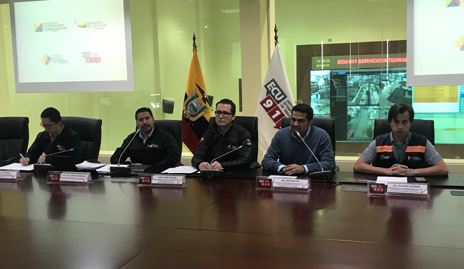 En este espacio de información participaron el economista Pablo Calle, director de la Agencia Nacional de Tránsito; abogado Guillermo Rodríguez, subsecretario del Ministerio del Interior; magíster Sixto Heras, subdirector General del Servicio Integrado ECU 911; abogado José Gálvez, director Ejecutivo de la Agencia Nacional de Tránsito del Ecuador; e, ingeniero Álvaro Guzmán, subsecretario de Transporte Terrestre del Ministerio de Transporte y Obras Públicas.