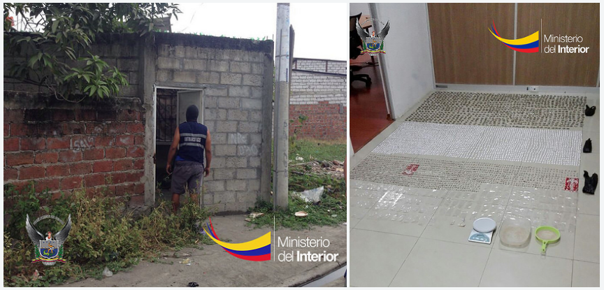 El primer procedimiento se dio en la cooperativa Desarrollo Comunal, localizada en la Isla Trinitaria, sur de Guayaquil, por parte de elementos de la Unidad Antinarcóticos de la Zona 8, quienes arrestaron a Kevin Jimmy R. C., de 21 años de edad, quien tenía en su poder 280,5 gramos de heroína, 595 gramos de cocaína, 538 gramos de marihuana y 50,80 dólares en efectivo.