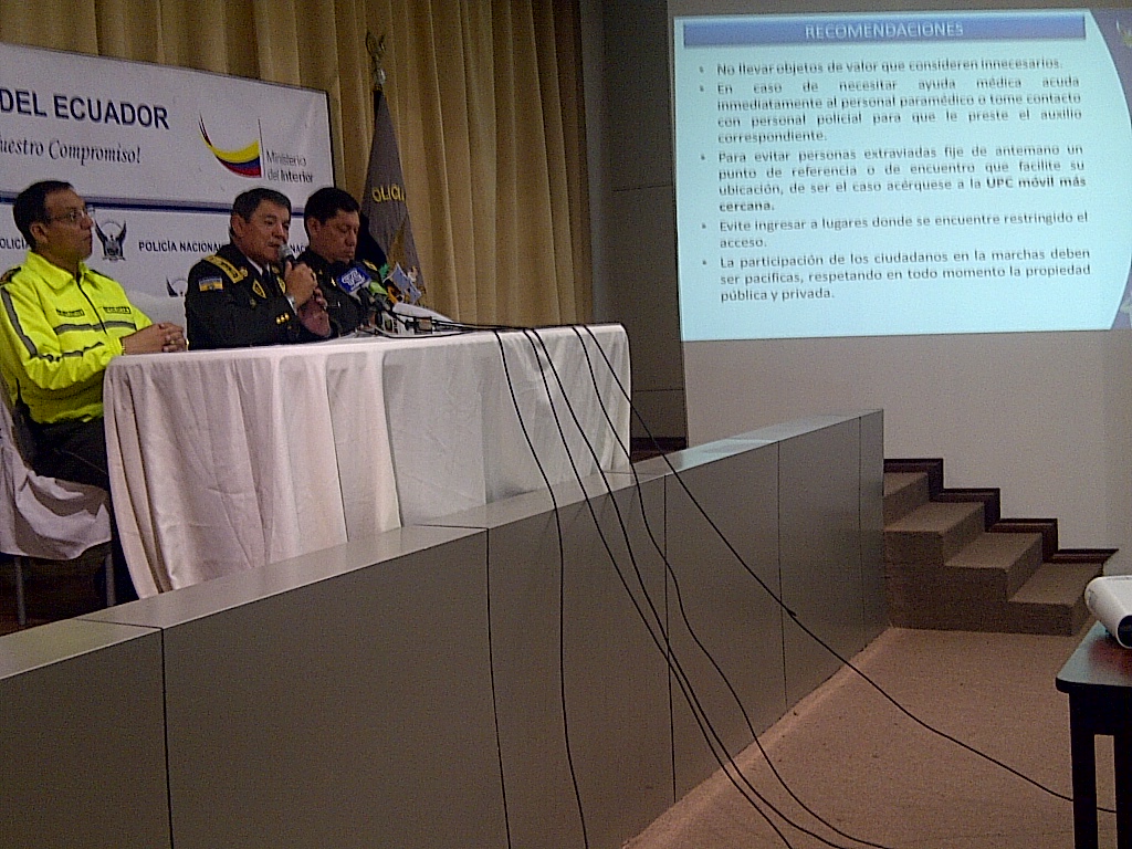Personal de la Compañia de Mantenimiento del Orden, Jefatura Provincial de Inteligencia Pichincha, Dirección Nacional de Policía Especializada para Niños, Niñas y Adolescentes, Unidad de Equitación y Remonta, Centro Regional de Adiestramiento Canino, Policía Judicial, Grupo de Intervención y Rescate, Grupo de Operaciones Especiales y Aeropolicial, cumplirán acciones específicas con el apoyo de 12 vehículos, 12 motocicletas, 30 radios, una UMAC, 24 acemilas, 16 canes y 92 vallas, para precautelar y garantizar la seguridad de las personas, los bienes públicos y privados.