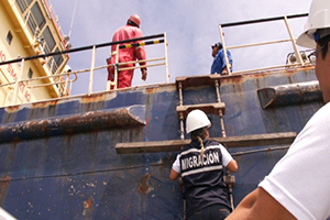 El jefe del área en el Puerto de Guayaquil, Tito Cely, relató que el trabajo del personal que labora en el lugar, es mantener contacto con la agencia Naviera, encargada de notificarlos del día y hora en que arriban las embarcaciones. Una vez que han anclado, junto a funcionarios de las Fuerzas Armadas, Ministerio de Salud y Agencia Naviera solicitan a los visitantes sus documentos de viaje.