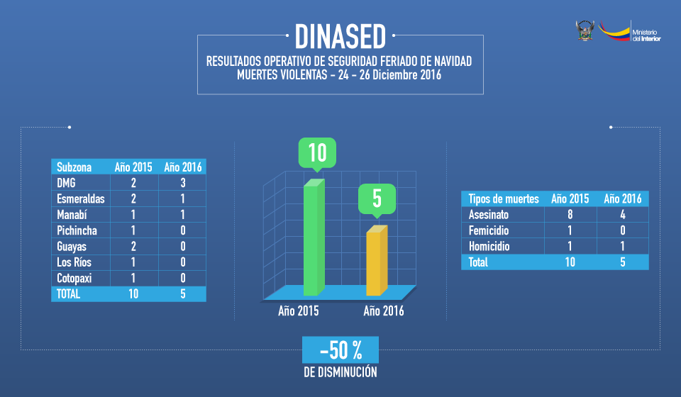 La Dinased, al presentar la evaluación final de Seguridad y Control Feriado de Navidad 2016(24, 25 y 26 de diciembre) expone una reducción de cinco muertes violentas a comparación del 2015 en las que se registraron 10 fallecimientos.