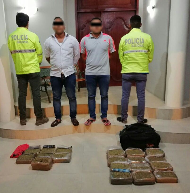Manta, 24 de abril de 2018. La Policía Nacional detuvo a dos presuntos distribuidores de droga e incautó cerca de 20 kilos de marihuana, en el operativo antinarcóticos Jocay 1, ejecutado la noche de este lunes 23 de abril.