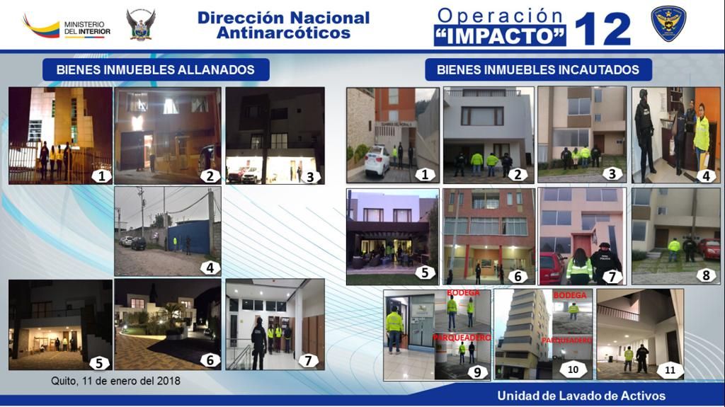 Quito. Cuatro detenidos, 11 bienes incautados, millonarios movimientos financieros y la identificación de una presunta red transnacional dedicada al lavado de activos es el resultado del operativo Impacto 12, ejecutado por la Unidad de Lavado de Activos (ULA), de la Policía Nacional, desde el martes 09 hasta el viernes 12 de enero de 2017, en la capital.