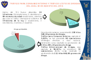 Quito.- Los diferentes operativos realizados durante la semana del 24 al 30 de agosto del 2014, por personal Antinarcóticos de la Policía Nacional en las distintas provincias del país, permitieron la aprehensión de un total de 230 kilos 549,05 gramos de droga, así como, la detención de 67 ciudadanos (56 ecuatorianos, ocho colombianos, dos serbios, un español) y el aislamiento de ocho menores de edad ecuatorianos.
