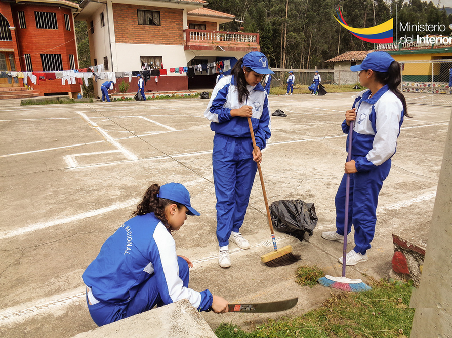 Cuenca.- Las escobas, recogedores, palas y machetes fueron las herramientas con las que las aspirantes a policías de la Escuela de Formación Froilán Jiménez realizaron limpieza, durante una minga comunitaria desarrollada en la parroquia Chiquintad, lugar en el que está emplazada la escuela.