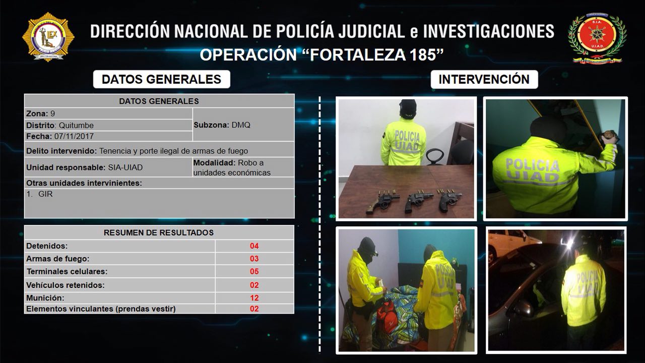 El operativo fue realizado por uniformados de la Policía Judicial y de la Subdirección de Inteligencia Antidelincuencial (UIAD), quienes, tras el seguimiento, investigación e inteligencia, establecieron que eventos delictivos de similares características eran recurrentes en el sector de Quitumbe.