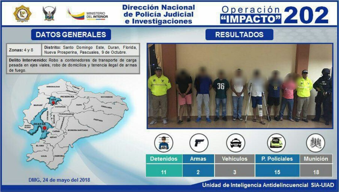 Guayaquil, 23 de mayo de 2018. Once personas, entre ellas tres privadas de la libertad que permanecen recluidas en la cárcel de Santo Domingo de los Tsáchilas, son investigadas por ser integrantes de una banda delictiva sospechosa de realizar diferentes tipos de delitos como: robo a contenedores en ejes viales, robos a domicilios, tenencia ilegal de armas de fuego.