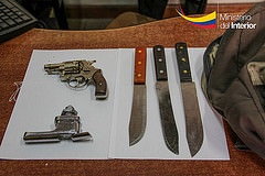 El sujeto fue neutralizado por otro policía que lo desarmó por la parte posterior, mientras los ciudadanos John P., Luis A., María S., y Johanna R., lanzaron objetos e insultos a los uniformados para evitar su detención. Después de retomar el orden, los policías registraron a los individuos y encontraron entre sus pertenencias tres cuchillos, un arma de fuego y varios accesorios.