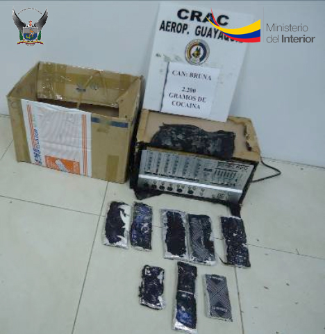Guayaquil. Personal de la Unidad de Antinarcóticos de la Zona 8 informó, esta mañana, sobre el decomiso de 2.1 kilos de cocaína, descubierta por el can Bruna, perteneciente al Centro Regional de Adiestramiento Canino (CRAC), durante una revisión de rutina en la bodega de envíos del Aeropuerto Internacional José Joaquín de Olmedo.