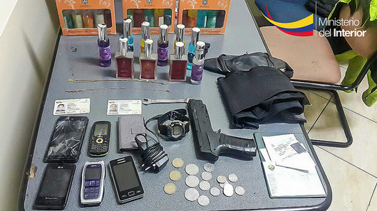 En poder del primero de los sospechosos, la Policía encontró un bolso negro en el cual hallaron un reloj, 11 cajas de perfume, dos cadenas, artículos de mujer, cuatro teléfonos celulares, un cargador y dinero en efectivo.