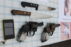 En su poder se halló dos revólveres de fabricación nacional, con seis cartuchos sin percutir cada uno, dos armas blancas marca tramontina y un teléfono celular. Procedieron a la detención de estas tres personas. Ahora son procesadas por el delito de contra la propiedad y la tenencia ilegal de armas de fuego.