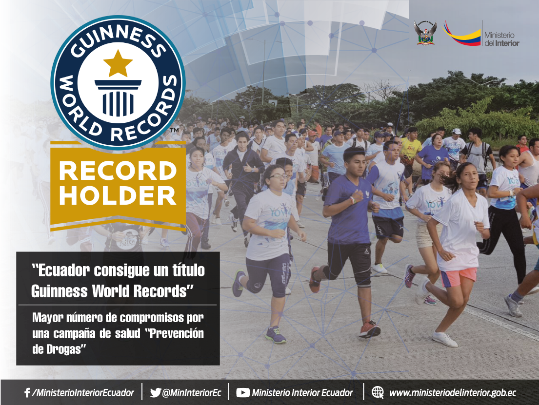 El mayor Marcelo Montenegro, coordinador de la carrera “Yo vivo sin drogas 5K, destacó que el nombre del récord conseguido este día es: Mayor número de compromisos por una campaña de salud “Prevención de Drogas”. Esta competencia se realizó simultáneamente, en las 24 capitales de provincias, 164.341 mil atletas intervinieron en el evento deportivo.