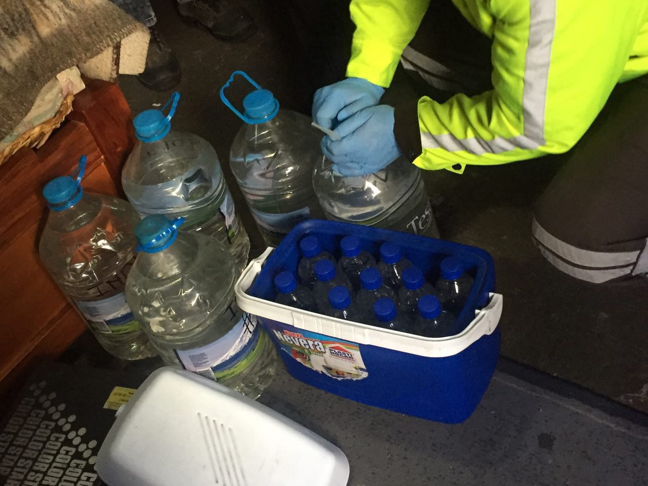 Utilizando diferentes técnicas especiales, la Policía Nacional coordinó con personal de la Dirección General de Inteligencia (DGI), Fiscalía General del Estado e Intendencia del Cantón Rumiñahui varios allanamientos en lugares donde se presume se comercializaba la venta de alcohol adulterado en sector de Sangolquí. Tras las acciones de detuvo a Luis LL. M, Silvia LL. M. y Heriberto A.M. y se confiscó 150 botellas de plástico de 400 ml y un botellón de plástico de 2500 ml con licor artesanal.