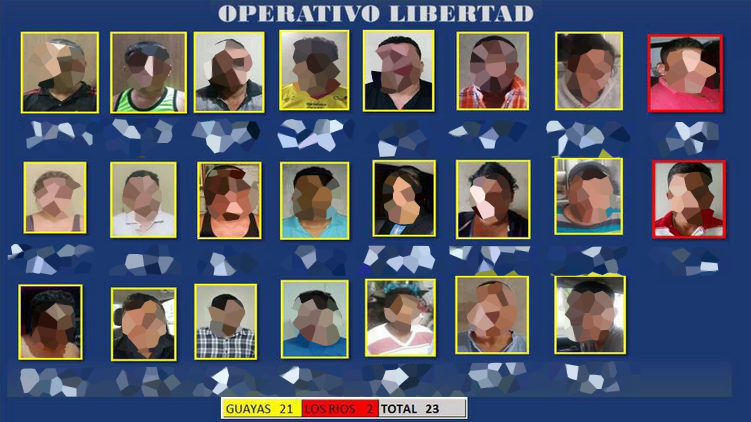 Mediante el Operativo denominado “Libertad”, desarrollado por la Dirección Nacional de Delitos contra la Vida, Muertes Violentas, Desapariciones, Extorsión y Secuestros (Dinased), a través de la Unidad Antisecuestros y Extorsión (Unase) y el apoyo de la Fiscalía, este jueves 01 de junio, en las provincias de Guayas y Los Ríos, se realizaron 22 allanamientos donde se detuvo a los presuntos autores de cinco hechos delictivos relacionados con el secuestro extorsivo, extorsión, robo y estafa.
