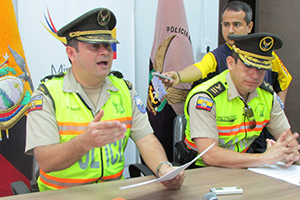Quevedo.- El jefe (e) del Distrito Quevedo de la Policía Nacional, teniente coronel Telmo Erazo, se refirió a la recuperación de carros, motocicletas, detenidos por tenencia ilegal de armas y de drogas, durante una rueda de prensa.