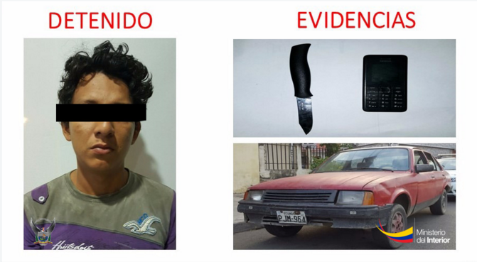 Al tratarse de un delito flagrante fue aprehendido Manuel de Jesús M. Z., de 36 años de edad, quien tiene 8 detenciones por diferentes delitos y dos boletas de detención, una en la Unidad Judicial Penal de Pichincha y Tránsito del cantón Santo Domingo. Los otros dos implicados fugaron al ver a la Policía Nacional. Como evidencias se encontró tarjetas de débito, 559 dólares en efectivo y celulares.