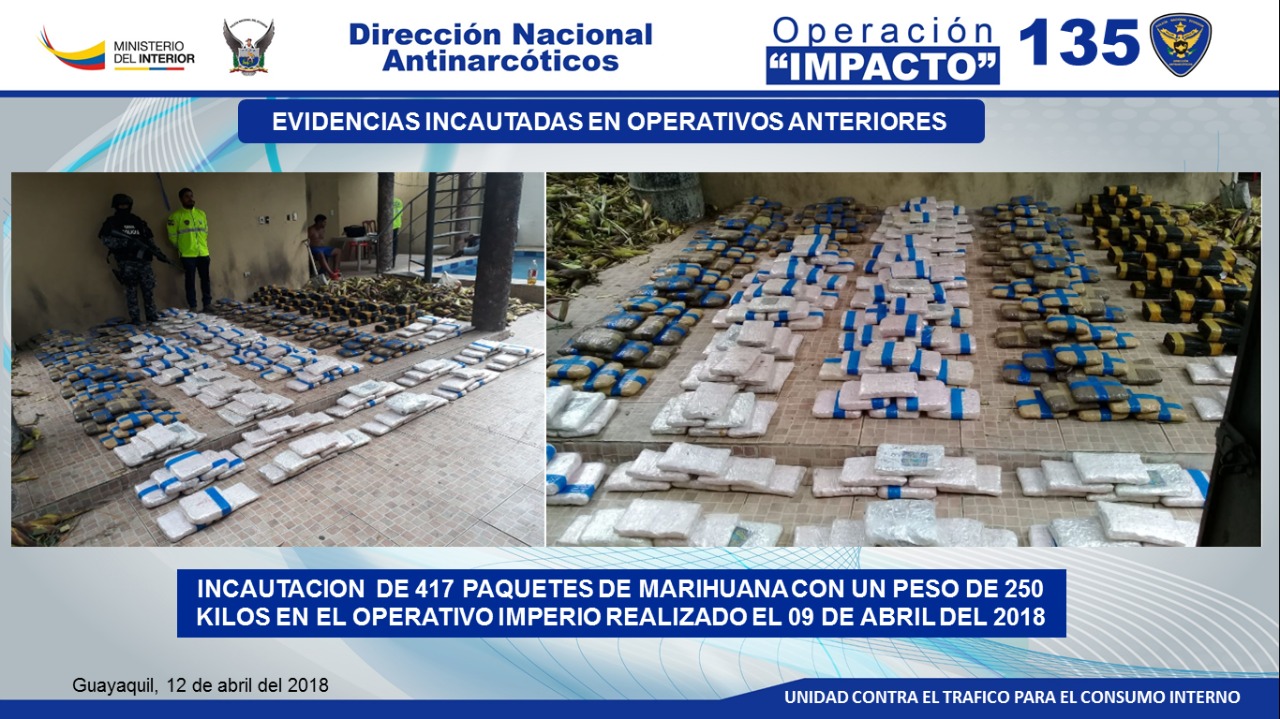 Tras labores de inteligencia desplegadas por seis meses, la operación denominada “Impacto 135” se desarrolló esta semana, entre los días lunes 9 y jueves 12 de abril, según lo informó, hoy, en rueda de prensa el coronel Edwin Noguera, jefe Provincial Antinarcóticos de la Zona 8, quien puntualizó que “prácticamente se ha desarticulado toda una banda narcodelictiva, pues fueron detenidos el líder, los responsables del acopio, abastecedores, intermediarios y expendedores de la droga”.