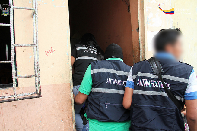 En primera instancia se allanó una vivienda ubicada en las calles Chambers y Leónidas Plaza, colindante con el parque de la Iglesia del Espíritu Santo. En el procedimiento se pudo detectar la presencia de varios paquetes de la droga conocida como H, marihuana y cocaína, así como fundas plásticas conteniendo billetes y monedas, probablemente producto de la comercialización de los alcaloides. El examen minucioso de los diferentes ambientes de la casa obtuvo como resultado la detección de la droga y el dinero camuflados en medias de niños, muñecos de peluche y otros escondites.