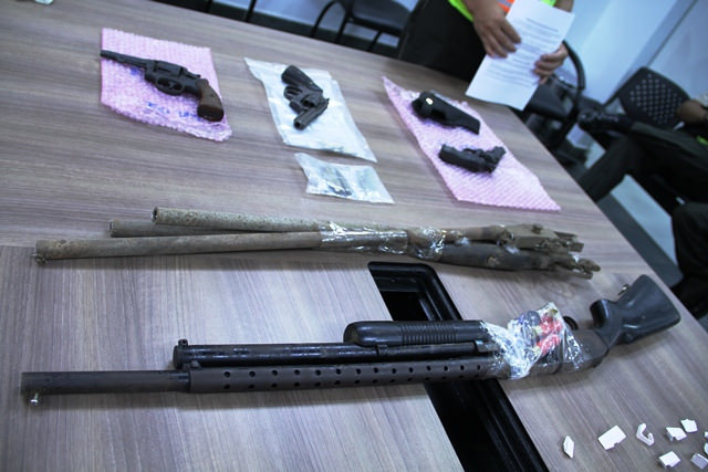 Las evidencias son un revólver marca Smith & Wesson, calibre 38; un revólver marca Taurus, calibre 38 con seis cartuchos; un revólver Hogue calibre 38, y una carabina marca Mosberth, calibre 16 con cinco cartuchos.