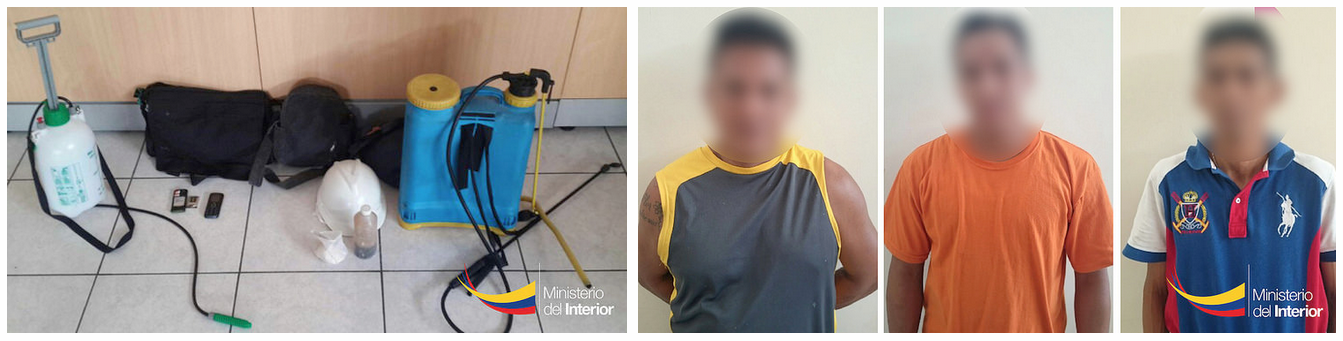 Agentes de la Brigada Anticriminal (BAC) de la Zona 8, en conocimiento del caso detuvieron a tres personas: Darwin David C.Y., Freddy Raúl V. De la C., y Miguel Ángel Z. Y. Los sujetos tenían en su poder de dos bombas fumigadoras y tres mochilas, asemejándose a los servidores públicos del SNEM.