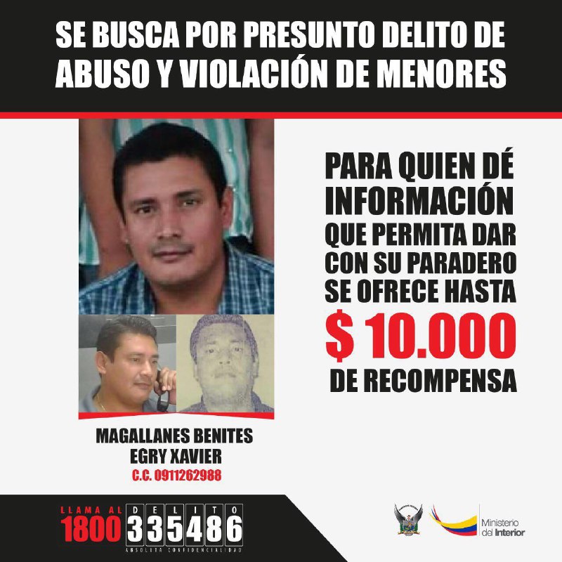 El Ministerio del Interior con el objetivo de que este caso no quede en la impunidad y se logre la captura inmediata del ciudadano Egry Xavier M. B., ofrece una recompensa de hasta 10 mil dólares americanos a quien brinde información verificable sobre la ubicación del prófugo y pueda ser puesto ante la justicia.