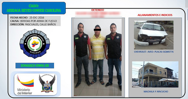 En una de las intervenciones policiales se detuvo a Jimmy Alfredo S. Ll., quien fue denunciado por testigos presenciales como la persona que llegó hasta la habría llegado en un automóvil hasta cooperativa Asaab Bucaram en la parroquia Pascuales, donde se encontraban varias personas habría disparado contra la humanidad de Ginger Carolina A.R. de 18 años, provocando su muerte. Investigación desplegadas por Dinased, ubicaron en las calles Honorato Vásquez y Cedros, al vehículo y a su conductor quien fue identificando plenamente por testigos presenciales como el responsable de este hecho de sangre.