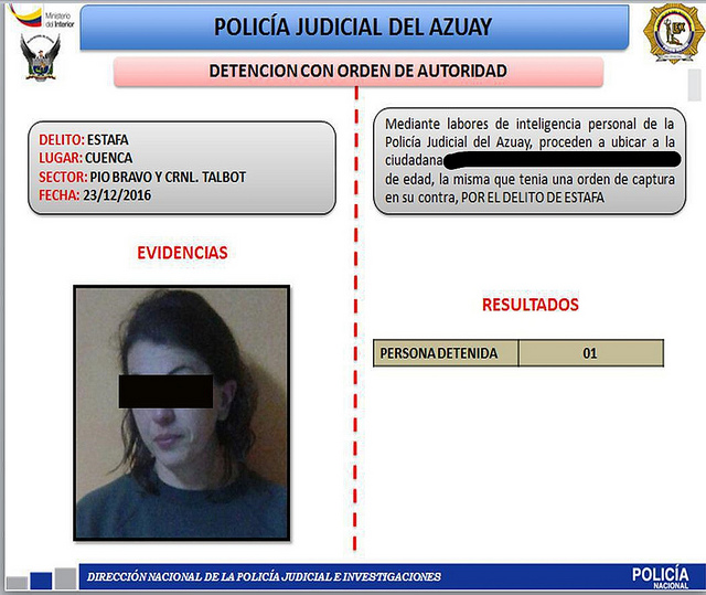 Por otro lado, la mañana de este viernes, en las calles Pio Bravo y Coronel Talbot, uniformados de la PJ de la sección de Capturadores, ubicaron a una mujer identificada como María T., de 39 años. Dentro del proceso investigativo, se conoció que la sospechosa posee una orden de captura por el presunto delito de estafa. Redacción Azuay.