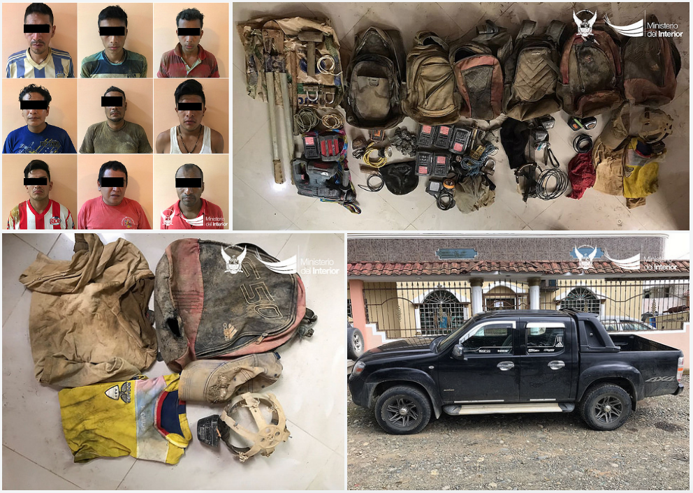El Mayor Solórzano destacó que como evidencias recuperaron una camioneta Mazda, doble cabina de color negro, de placas OBA1947; seis teléfonos celulares, de diferentes marcas; ocho bultos con material aurífero, seis fulminantes, una palanca metálica, cinco baterías, cuatro juego de llaves, siete maletas de diferentes marcas, tres cinceles metálicos, siete metros de mecha lenta, un cuchillo, cuatro prendas de vestir, un taladro portátil, un combo y nueve linternas.