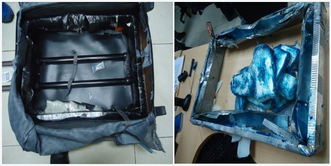 En el área de túnel de equipajes del aeropuerto, agentes del orden detectaron una maleta de color negra que contenía 11 paquetes en forma rectangular con 2.7 kilos de cocaína en la estructura metálica. La valija pertenecía al ciudadano Antonio D. P., quien se disponía a viajar a Barcelona. El sujeto fue detenido.