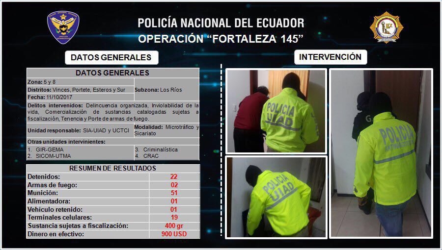 Como resultado de este operativo denominado Fortaleza 145, se detuvo a 22 presuntos delincuentes que conformaban una banda liderada por alias ‘Choclo’ y alias ‘Cojo Harry’ que operaban desde el Centro de Privación de Libertad Regional de Guayas.