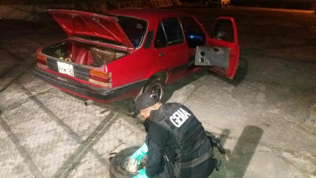 El personal policial del GEMA, el pasado 12 de Julio del 2017, pidió que se estacione un automóvil tipo Sedan, color rojo, que tenía como destino la ciudad de Quito. Al revisar la puerta lateral derecha observaron seis paquetes encaletados en el interior de la llanta de emergencia. Tenía ocho paquetes de pasta base de cocaína.
