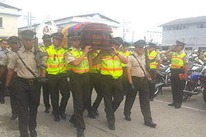 A las 10h00 de este jueves se realizó una misa, luego de lo cual le dieron honores. A las 11h30, el féretro fue llevado al Barrio San Juan Pomba, del cantón Chillanes en la provincia de Bolívar, de donde era oriundo el gendarme, mientras se escuchaba las notas del silencio con las cornetas y la banda musical de la Policía Nacional. / Redacción Guayas.