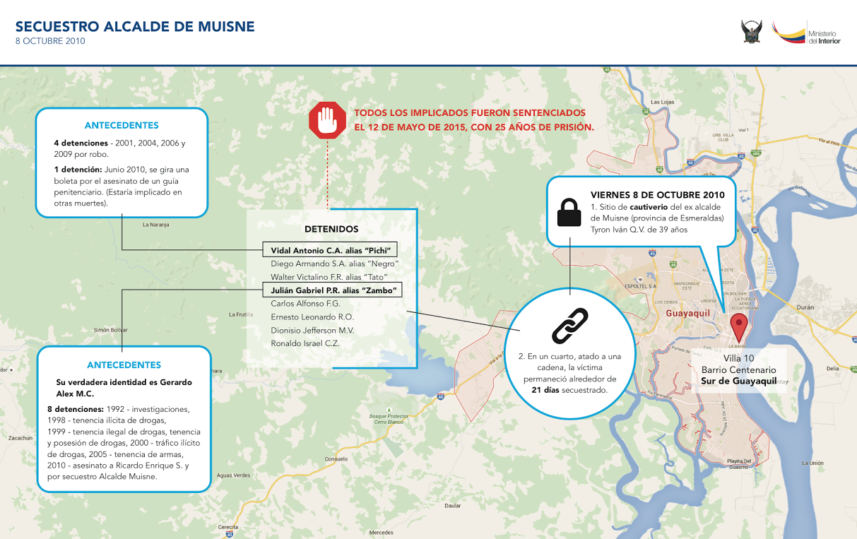 Las diversas acciones investigativas por parte de la Policía Nacional permitieron el rescate de Tyron Iván Quintero, exalcalde del cantón Muisne, Esmeraldas, quien habría sido secuestrado y trasladado a la ciudad de Guayaquil para su cautiverio en el 2010.