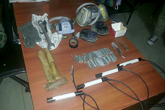 Los comandos encontraron cuatro tacos armados con mechas y fulminante, dos tacos más de dinamita mojados, 60 cápsulas de fulminantes, cuatro fulminantes con mechas, dos máscaras de gas, guantes y camisetas.