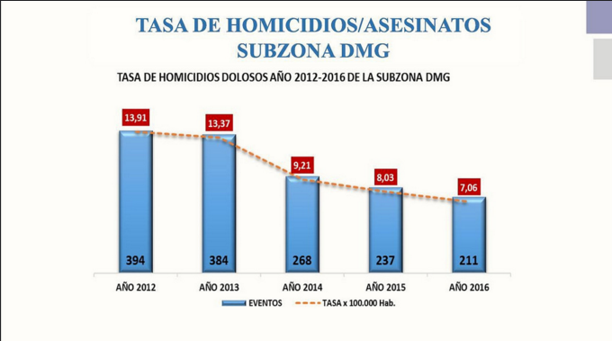En crímenes registrados, la baja es de un 11 %, pasando de 237 casos en el 2015 a 211 en el 2016. La disminución que se alcanzó en comparación con el resto del país es notoria, quedando en 7.06 la tasa de muertes violentas por cada 100 mil habitantes en la Zona 8. Recordemos que en el 2012 se produjeron 394 muertes.
