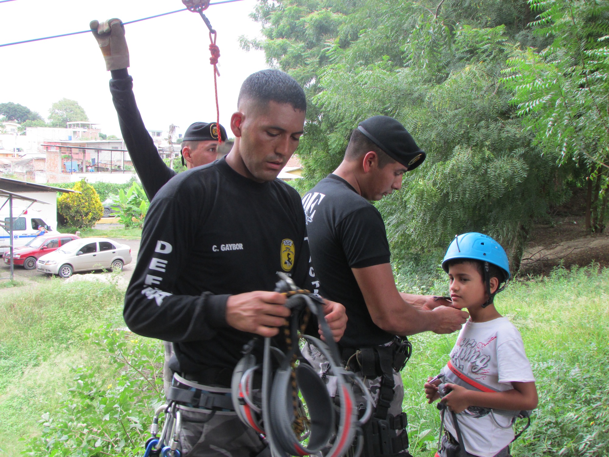 Teniente Cristhian Gaibor,preparando a los cursantes para la práctica de tirolina
