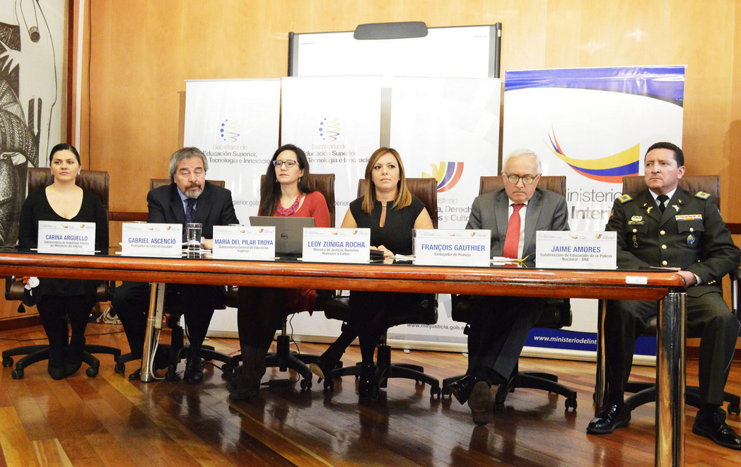 El evento se desarrolló en el salón Arutam, de la Secretaria de Educación Superior, Ciencia, Tecnología e Innovación (Senecyt), en presencia de la subsecretaria de Seguridad Interna, Carina Arguello; la ministra de Justicia Derechos Humanos y Cultos, Ledy Zúñiga; la subsecretaria de Educación Superior, María Pilar Troya; el embajador de Francia, François Gauthier, entre otras autoridades.