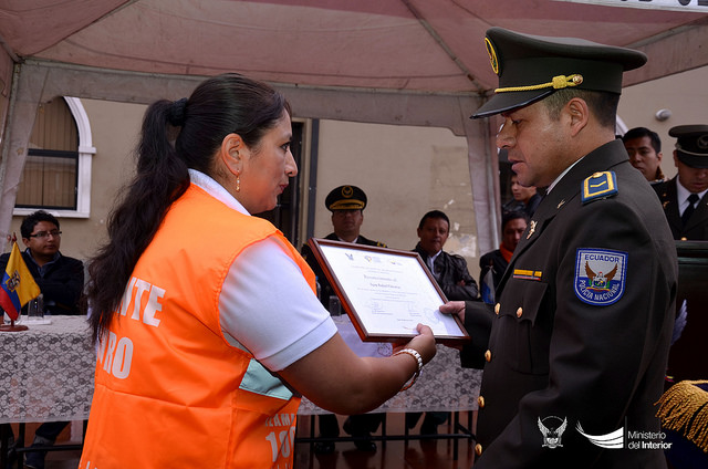 Carina Argüello, subsecretaria de Seguridad Interna, junto con el general Mauricio Gutiérrez, comandante del DMQ, entregaron certificados a los 24 ciudadanos, con los que se oficializa su compromiso por la seguridad de la comunidad y vecinos que conviven en el Centro Histórico.