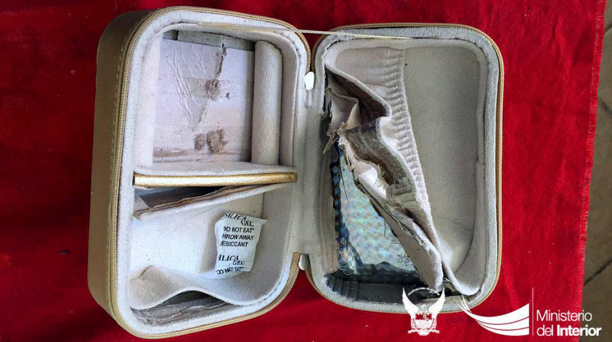 Los trabajos de rutina desplegados por agentes de la Jefatura Antinarcóticos, durante los controles a los diferentes paquetes, nuevamente dieron resultados positivos. Dentro de una caja de cartón de color dorado, con guía de ingreso 40658, que era utilizada para guardar joyas, camufladas en un doble fondo fueron localizadas dos envolturas de papel plateado. Dentro de estas fundas se descubrió una sustancia pastosa de color blanco, que luego de las pruebas de campo realizadas dieron positivo para clorhidrato de cocaína, con un peso de 425 gr.