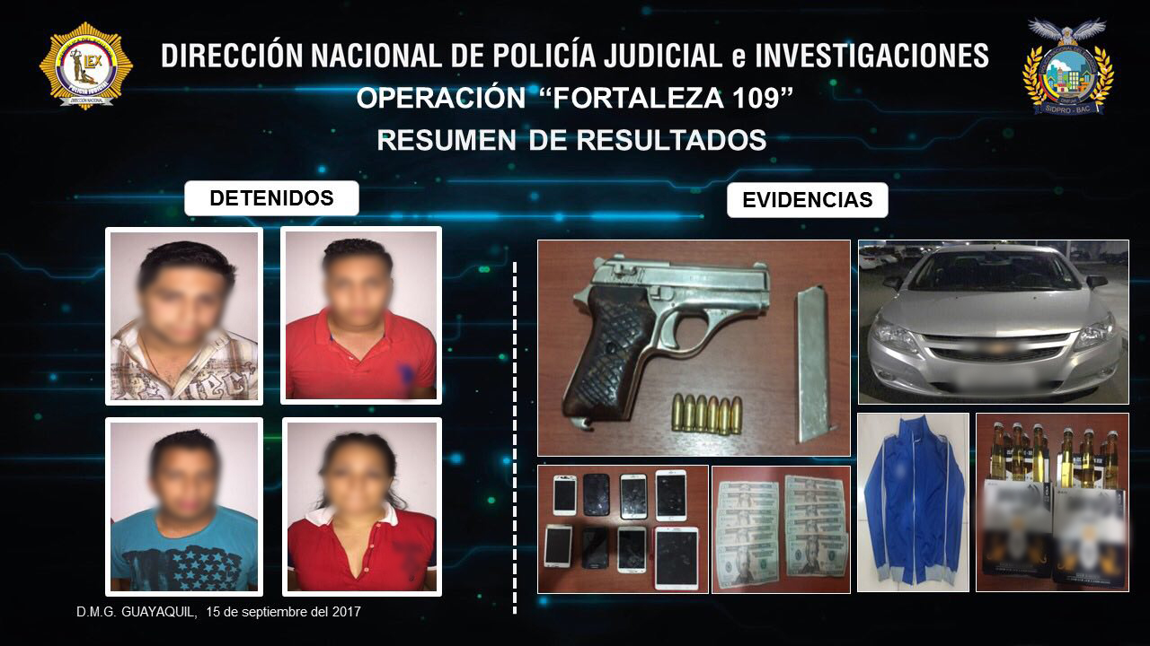 El viernes, 15 de septiembre del 2017, el capitán Marco Pilco Mayorga, a cargo de la operación, explicó que en el allanamiento se encontró a la ciudadana de nacionalidad colombiana, Natalia S. S., de 27 años de edad, (sin antecedentes); junto a tres ciudadanos ecuatorianos Carlos Daniel G. G, 26 años (dos detenciones por robo), Daniel David Y. E., 26 años, y Deni Christian, de 25 años (ambos sin antecedentes).