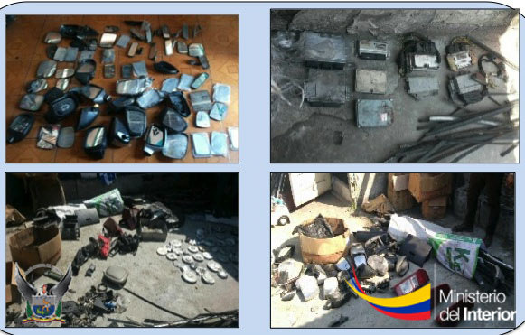 Como evidencias se confiscó un carro Chevrolet Vitara blanco GMH-366, un Corsa Evolution blanco, GPJ-187 y un Mitsubishi Space, color vino, GJP-759; así como también cuatro laptops, 28 cerebros, 64 marcos y retrovisores, 45 tapacubos, 860 dólares, cinco llantas con aros, 19 radios, una potencia de carro, dos amplificadores, cuatro gatas hidráulicas, dos radios de comunicación, 11 celulares, una cámara digital, entre otros accesorios.