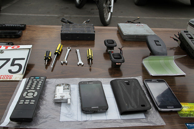 Entre las evidencias constan dos motocicletas, decenas de radios, accesorios de vehículos, repuestos nuevos y usados, neumáticos, aros, cerca de 800 dólares en efectivo, tarjetas de crédito, teléfonos celulares, entre otras cosas.
