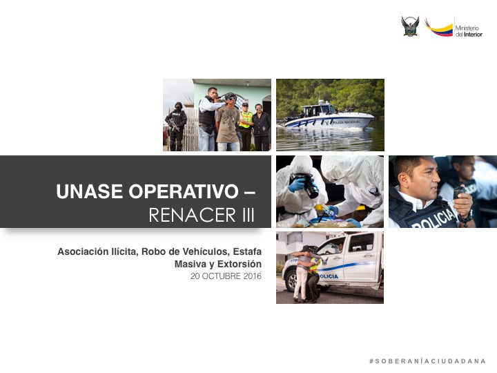 Guayaquil.- Un total de 42 personas presuntamente relacionadas con los delitos de asociación ilícita, robo de vehículos, estafa masiva y extorsión, fueron detenidas durante el operativo Renacer III, ejecutado de forma simultánea en las provincias de Pichincha, Guayas y Manabí, la madrugada de este jueves 20 de octubre, informó Diego Fuentes, viceministro de Seguridad Interna, en las instalaciones del ECU-911 de la ciudad de Guayaquil.