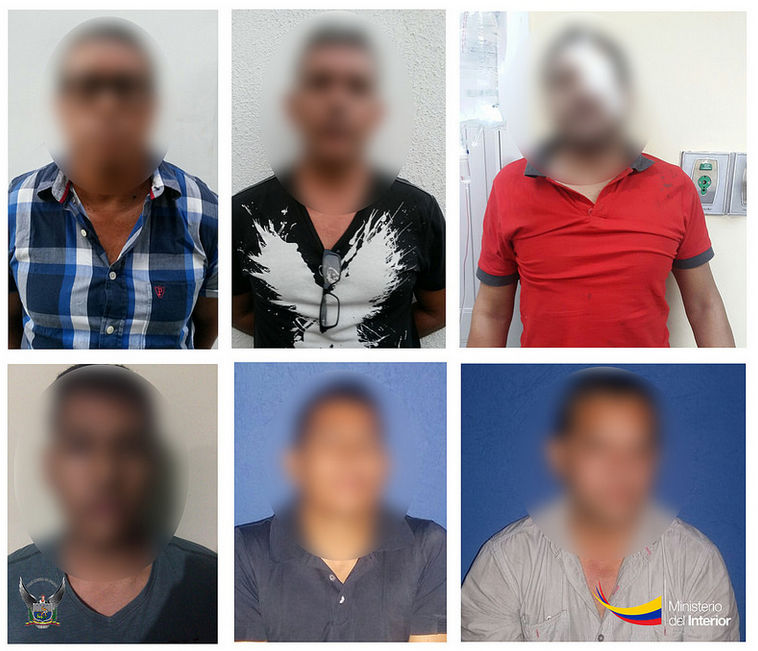En los registros de la Policía constan seis detenidos: Christian David M. U., William Orlando P. CH., José Luis G. A., Jairo M. S. (todos colombianos) y los ecuatorianos César Alberto F. C. y Jimmy Gastón L. M.