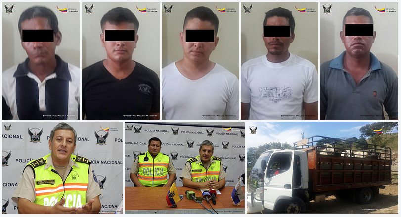 Pedernales.- En un control policial, realizado en la vía a Chamanga, fueron detenidas cinco personas quienes pertenecerían presumiblemente a una organización delictiva dedicada al robo de ganado en Pedernales. En un camión, los sujetos estaban transportando el ganado, que horas antes había sido robado.
