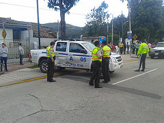 Tras conocer el hecho, la Policía emprendió la búsqueda de los sospechosos iniciando una persecución por el sector sur de la ciudad. Tras localizar a la motocicleta con los presuntos delincuentes, uno de los patrulleros de la Policía chocó contra un jeep en el sector de los Tres Puentes.