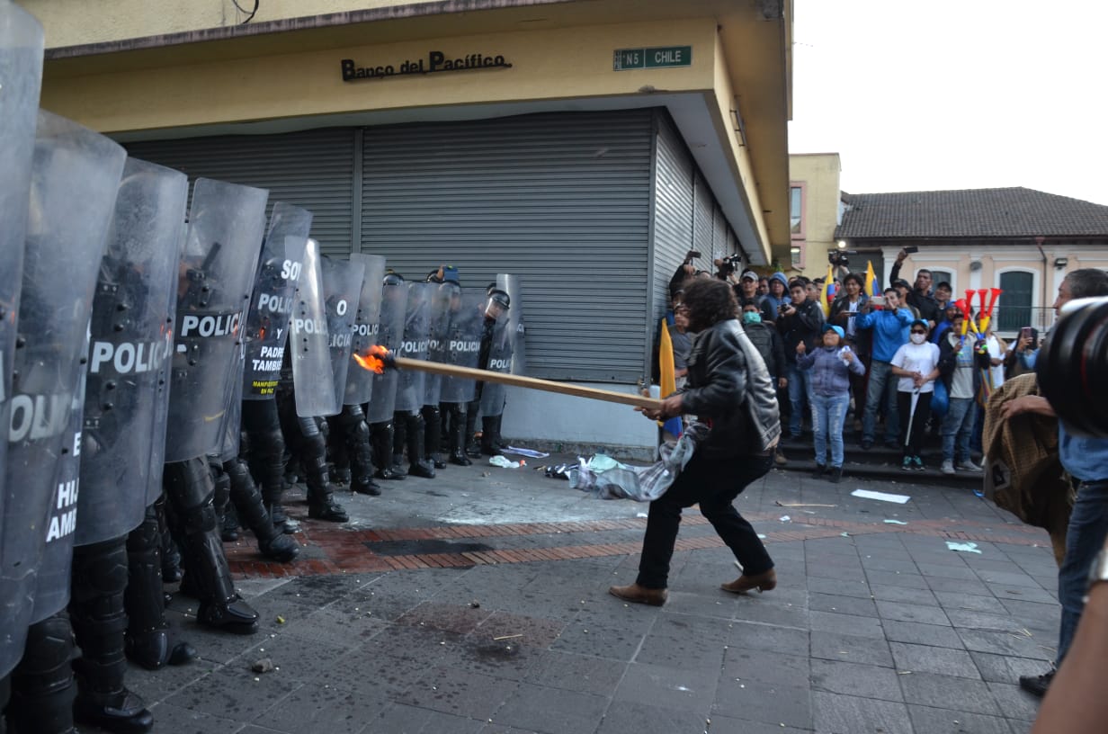 Quito, 06 de julio de 2018. La Policía Nacional rechaza las agresiones suscitadas, este jueves 5 de julio, en las calles aledañas al Palacio de Carondelet, donde violentos manifestantes agredieron a ocho servidores policiales.
