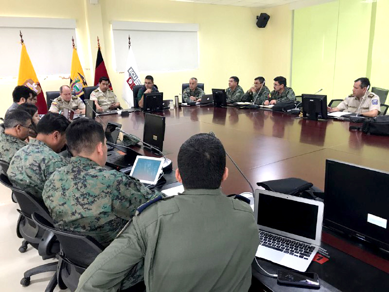 Quito.- Con el objetivo de delinear estrategias para la ejecución del Estado de Excepción en Zaruma, la mañana de este sábado 16 de septiembre del 2017, representantes del Ministerio del Interior y Defensa, autoridades operativas de la Policía Nacional y Fuerzas Armadas, se reunieron en las instalaciones del ECU 911, en Quito.